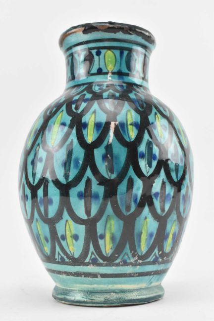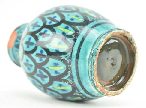 A 19th century Persian terracotta hand painted turquoise vase. The vase of baluster form, painted with black & blue feather style design on turquoise ground. Chip to rim.