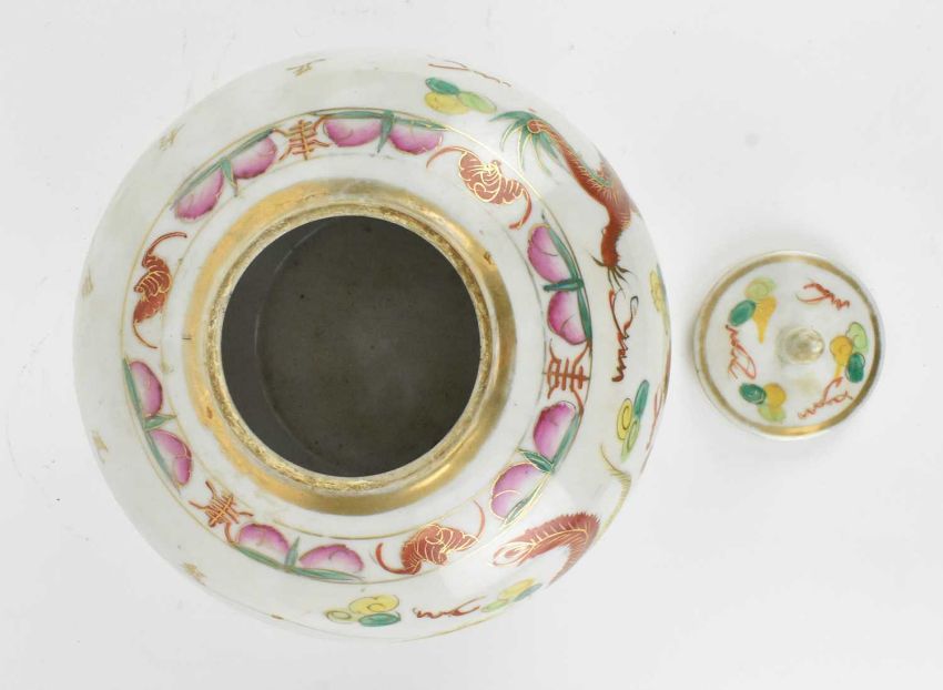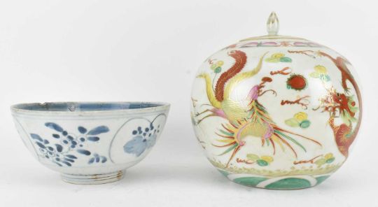 Two late Qing early Republic period porcelain pieces. The lot comprising a globular shape famille rose and gilt ginger jar decorated with Dragon and Phoenix chasing flaming pearl on the body, reverse a Chinese gilt poem, peaches and bat on the neck with a cover decorated with ruyi cloud motif and a teardrop finial, together with a blue and white owl decorated with gourd in the centre well, flowers and lotus leaves to exterior.