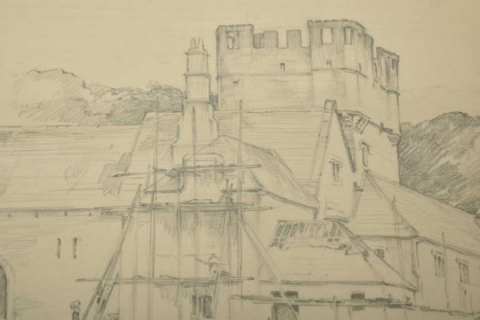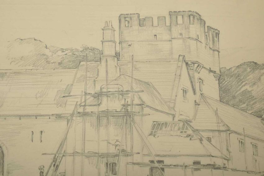 Cyril Walduck Edwards (British, 1902-1982) - Two original 20th century pencil and watercolour on paper preparatory sketch drawings of medieval village. Being a pencil on paper sketch, together with a watercolor on paper painting. Unsigned. All mounted, framed & glazed.