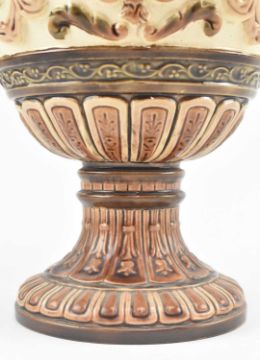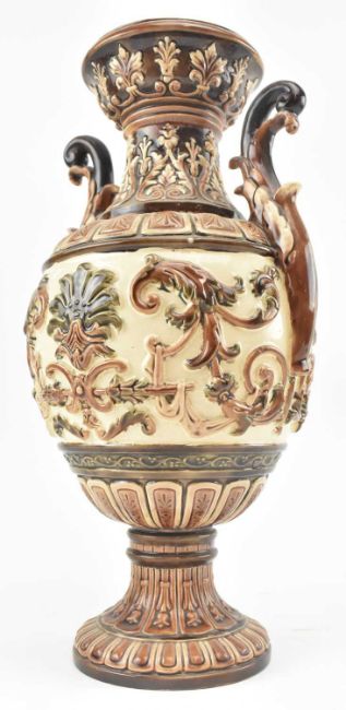 A late 19th century Victorian Aesthetic Movement stoneware vase. The vase in hues of brown, green & cream, featuring relief scrolled foliate design in the style of Lambeth Doulton & Wilhelm Schiller and Sons. Impressed mark 30 to underside.