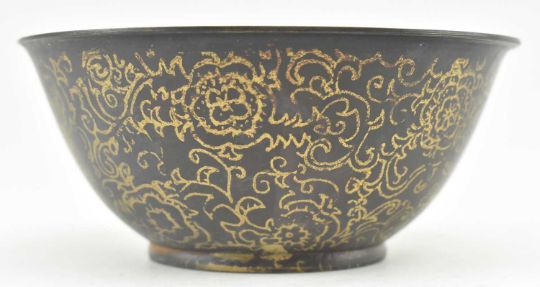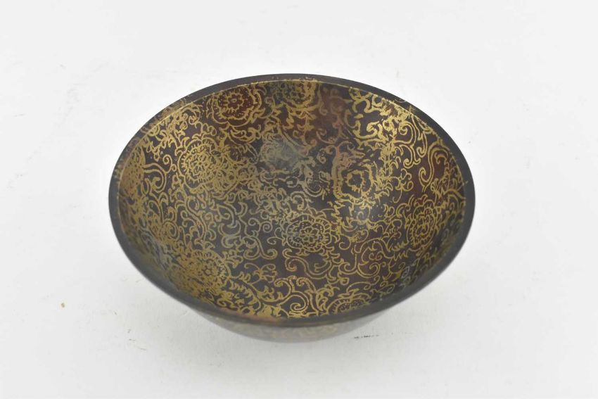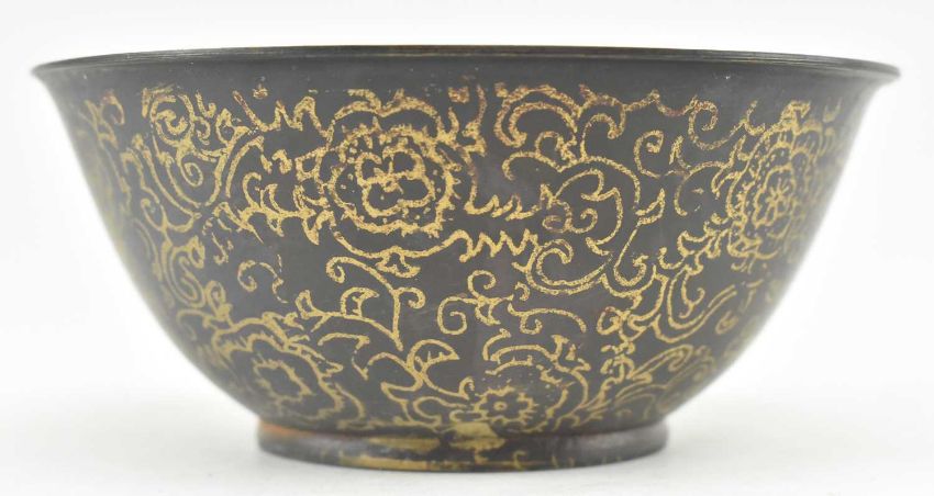A collection of 20th century Chinese lacquerware. The lot comprising a lidded pot with inlaid scene of elders to lid; a lidded pot in the form of a duck with gilt decoration, and three bowls, one being metal and a pair of wooden bowls, each with decorative scrolled gilt design. Four character mark to underside of the metal bowl.