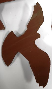 Former Bristol Zoo Gardens - Metal Birds - a collection of x5 original decorative metal birds, originally housed on the exterior of The Hide restaurant (build c2017). Each of steel construction, with mounting posts. Brown painted. Largest has 62cm wingspan.