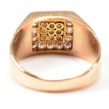 A hallmarked 18ct gold and diamond signet ring. The ring having a square face set with nine round cut diamonds in a square formation surrounded by a halo of sixteen round cut diamonds with etched shoulders to tapered shank. Hallmarked for Sheffield, 2003. Sponsor's mark J.I. Size U.5-V. Weighs 10.0g. All weights, measurements and sizes are approximate.
