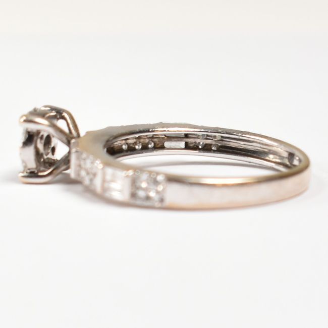 An 18ct white gold and diamond cluster ring. The ring having baguette and round brilliant cut diamond set shoulders. Stamped 750 in a diamond lozenge tests indicate 18ct gold. Size P. Weight 3.8 g. All weights sizes and measurements are approximate.