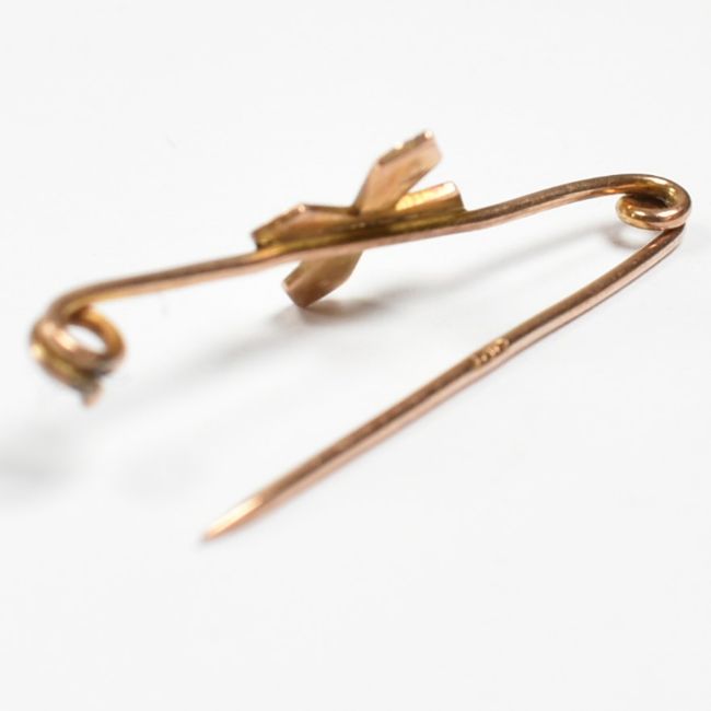 Two early 20th century 9ct gold brooch pins. The brooches to include a cross set with pearl and ruby, stamped 9ct to pin. Together with an amethyst and pearl set pin stamped 9ct to shoulder. Total weight 2.2 g. Measures 3 - 3.4 cm. All weights, measurements and sizes are approximate.