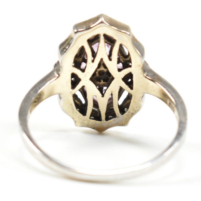 A hallmarked 18ct white gold diamond and pink sapphire ring. The 18ct white gold ring having a central notched bezel set round single cut diamond set in a pierced mount, surrounded by a halo of calibre cut purplish pink sapphire to scrolling border set with illusion set diamonds to tapered shank. Hallmarked for Birmingham, 2007. Sponsor's mark LA. Size Q. Weighs 4.7g. All weights, measurements and sizes are approximate.