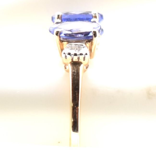 A hallmarked 9ct gold AAA tanzanite and diamond three stone ring. The 9ct yellow gold ring set with three oval cut AAA tanzanite and six baguette cut diamonds to tapering shank. Hallmarked for Birmingham, 2013. Sponsor's mark TGGC. Weight 1.9g. Size: N. With certificate. Limited edition, one of ten pieces from the Jacque Christie collection. All weights, measurements and sizes are approximate.