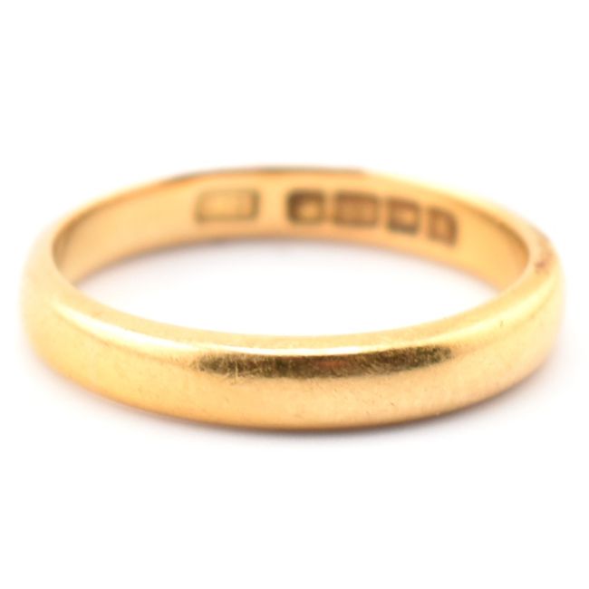 A hallmarked 22ct gold band ring. The 22ct yellow gold band ring hallmarked for Birmingham, 1935. Maker's mark SH. Size J. Weighs 3.1g. All weights, measurements and sizes are approximate.