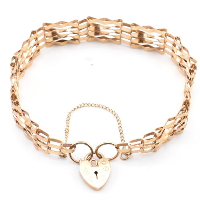 A hallmarked 9ct gold gate link bracelet with heart padlock clasp. The hallmarked 9ct yellow gold bracelet having twisted links to heart padlock clasp and safety chain. Heart padlock clasp hallmarked for London, 1979 together with sponsor's mark LC. Gate link chain bracelet hallmarked for London, 1979 together with sponsor's mark VM. Measures 20cm. Weighs 8.4g. All weights, measurements and sizes are approximate.