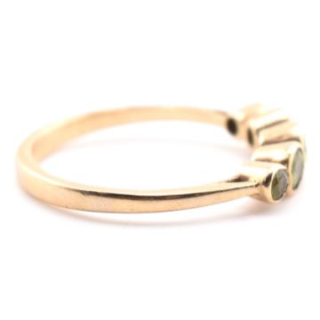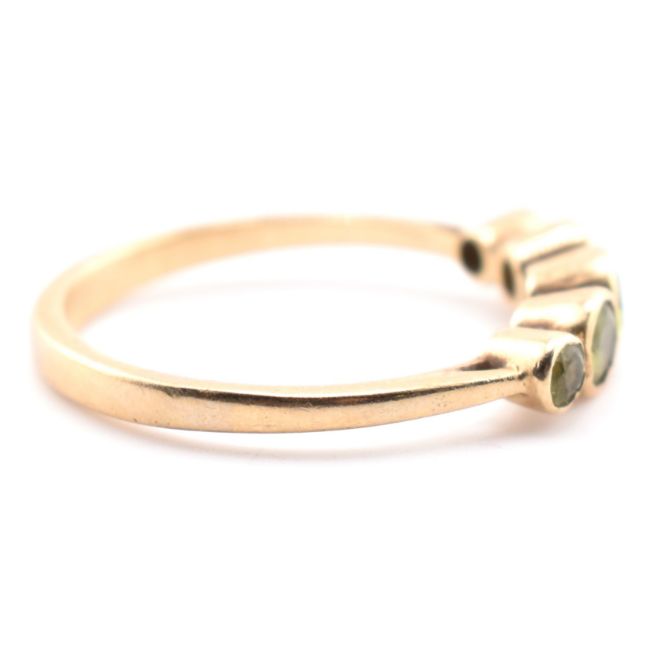 A hallmarked 9ct gold and peridot five stone ring. The 9ct yellow gold ring set with five graduating bezel set round cut peridots to polished shank. Hallmarked for Birmingham together with sponsor's mark TH. Weight 2.2g. Size: O. All weights, measurements and sizes are approximate.DLD