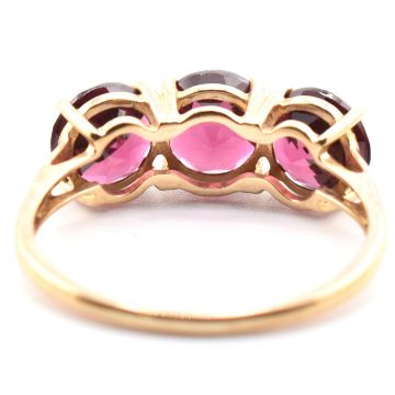 A hallmarked 9ct gold and garnet three stone ring. The 9ct yellow gold ring set with three round cut garnets to tapered shank. Hallmarked for Birmingham, 2017. Size S. Weighs 2.9g. All weights, measurements and sizes are approximate.