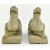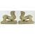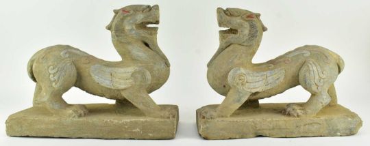 A large pair of carved limestone in form of Chinese mythical beast Pixiu. Each pixiu carved as a crouching winged mythical beast, with large eyes, upturned snout, pricked ears, and a short mane extending to the rectangular socket in the back, painted in red and blue or black with feather marking, stands on four large four-clawed feet.