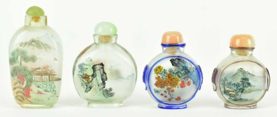 A collection of ten glass inside painted snuff bottles. The lot comprising an oviod shaped snuf bottle with faucet cut stopper, inside painted with lanscape, lion mask on each side, a square snuff bottle depicts a gold fishes, landscape, lotus flowers and crane, a rectangular shaped snuff bottle depicts houses, landscape and figurines, a white glass snuff bottle with boats and riverscape, further five small moon flask snuff bottles with different colour border, landscapes and birds.