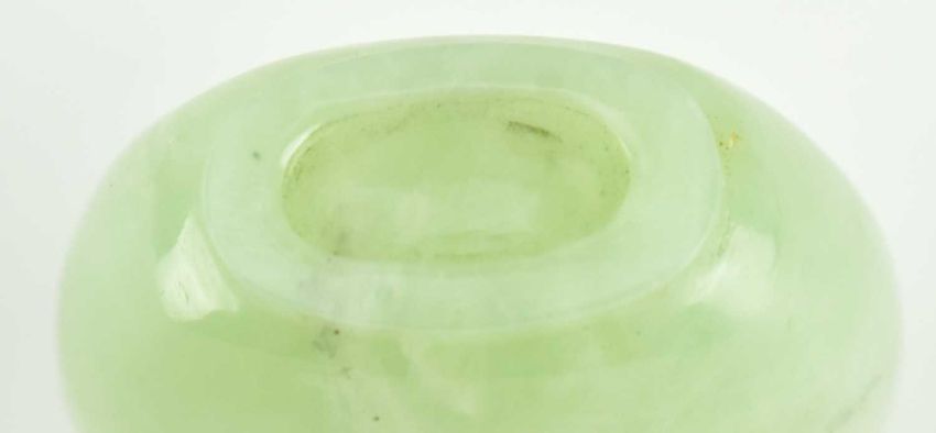 A Qing dynasty celadon jade snuff bottle. The rounded rectangular form with a cylindrical neck and oval foot ring, comes with replaced stopper.