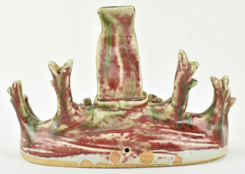 A flambe-glazed ceramic brush holder. The brusher holder modelled in form of a dragon, with fierce eyes, curls in head with horns.