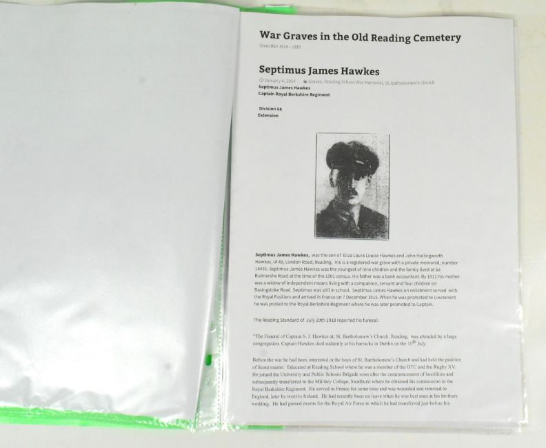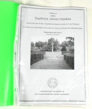 WWI Medal Group - awarded to one Captain Septimus James Hawkes of the Royal Berkshire Regiment, who died 10th July 1918, aged 23. Comprising: 1914-15 Star, War Medal and Victory Medal. All officially impressed CAPT S. HAWKES. With ribbons. Supplied with a folder of research including detailed family history, photograph, and a photograph of the Reading Cemetary memorial upon which he is named.