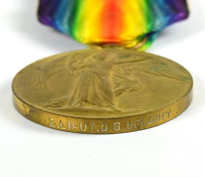 WWI Medal Group & Effects - medal group awarded to one 2nd Lieutenant Gordon Gray Doughty of the 1st Battalion King's Own Scottish Borderers, KIA 11th April 1918. Comprising his 1914-15 Star (275535 Pte G. G. Doughty Royal Scots), War Medal (2. Lieut. G. G. Doughty) and Victory Medal (2. Lieut. G. G. Doughty). Along with Doughty's hallmarked silver Caron Medal school medallion for 'Best Engish Essay' dated 1911, hallmarked for James Kettie & Son, Aberdeen (55g), his silver Dalton Medal from the Royal High School, Edinburgh dated 1909 and hallmarked for Vaughton & Sons, Birmingham (46g). Supplied with a folder of research including copies of service history, university rolls, photographs, and other items.