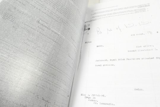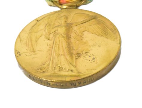 WWI Medal - Victory medal for one Captain Henry Pritchard attached to Hood Battalion, Royal Welsh Fusiliers. Died 7th April 1918, age 28, during engagement at Aveluy Wood, the Somme whilst listed as a Temporary Second Lieutenant. Medal impressed 'CAPT. H. PRITCHARD,' with original ribbon. Accompanied by a large folder of research which includes copied service documents, typed history, casualty details, Military History, and other documents. In 1911 Henry was a Light Keeper on the South Bishop Lighthouse, Pembrokeshire.