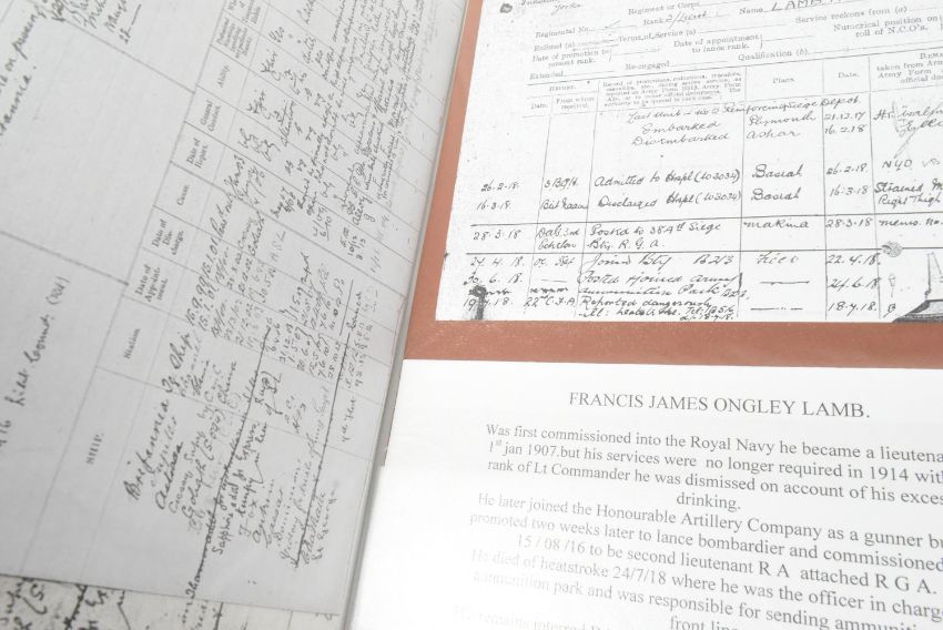 WWI Medals & Memorial Plaque - issued to Second Lieutenant Francis James Ongley Lamb of the Royal Garrison Artillery attached to Army Ammunition Park. Died 24th July 1918, age 33. Comprising his War Medal (2. LIEUT. F. J. O. LAMB) and Victory Medal (ditto), with ribbons. Along with his Death Plaque. Framed, alongside a brief service history. Died of heatstroke where he was the officer in charge of an ammunition park and was responsible for sending ammunition to the front line, whilst serving in Baghdad. Accompanied by a folder of research including copied documents, details of his service, casualty reports, grave details and many other documents.