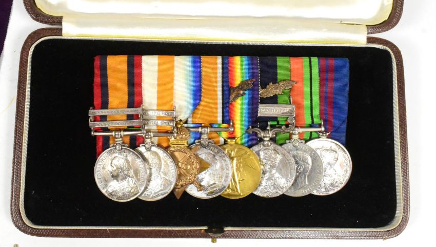 Medal Group - impressive medal group to one Major Ralph Henry Hammersley-Smith, CBE. Comprising: Victoria South Africa Campaign Medal with Orange Free State and Cape Colony clasps (Lt. R.H. Hammersley-Smith ASC), Edward VII South Africa Campaign Medal with 1901 & 1902 Clasps (R. H. Hammersley-Smith A.S.C), 1914-15 Star (name removed, possibly a replacement), War Medal (Maj R H Hammersley-Smith), Victory Medal with oak leaf (Maj R H Hammersley-Smith), India Medal with oak leaf and Ziristan 1919-21 clasp (TY Lt Col R. H. Hammersley-Smith - 47 DCO Sikhs), WWII War Medal, and George V Coronation Medal. Plus CBE. Mounted. Housed within a Spink & Son Ltd presentation case. Supplied with a folder of research / history, including: typed service history, copied service documents, Gazzette entries, and other documents. Please view images for typed service history.