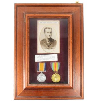 WWI Medals - medal pair issued to Second Lieutenant Cecil Victor Erwood of The King's Royal Rifle Corps, KIA 17th February 1917, near the village of Miraumont, France. Comprising War Medal (2. LIEUT. C. V. ERWOOD) and Victory Medal (ditto), with ribbons. Mounted alongside an original photograph and brief service history. Framed. Supplied with much research, including a copy of the book 'For King And Country - Edwardian On The Front' which features the life and letters of Erwood, a self-published manuscript 'School And Somme - The Letters OF Cecil Victor Erwood', and a folder of copied service documents, photographs of his memorial, and other documents.