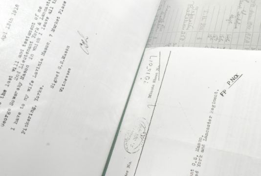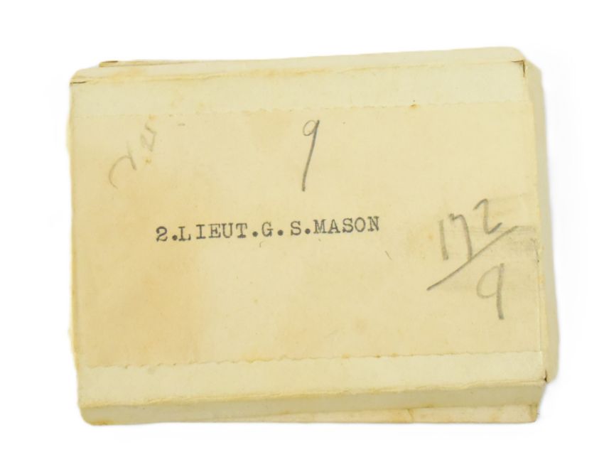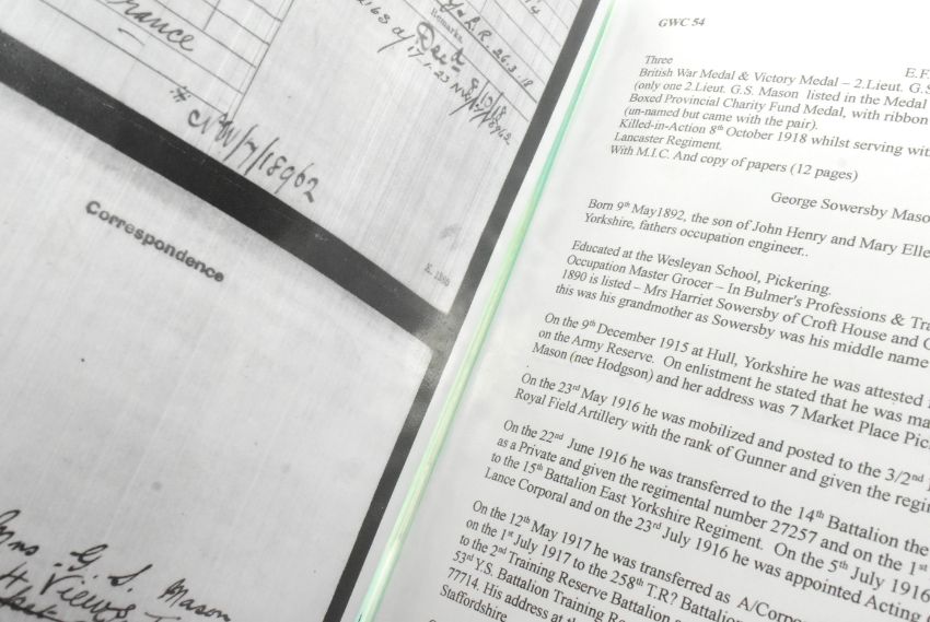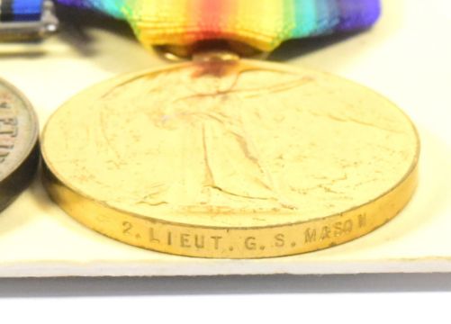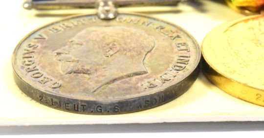 WWI Medals - medal pair awarded to Second Lieutenant George Sowersby Mason of the 2nd Battalion, York & Lancaster Regiment. KIA 8th October 1918, age 27. Wounded by a machine gun bullet to his neck, he and a fellow officer were killed by a shell as they made their way to a casualty station. Comprising War Medal (2. LIEUT. G. S. MASON) and Victory Medal (ditto) - both with ribbons, and one original box of issue. Supplied with a folder of research including typed life history, copied service documents, memorial photographs, and other documents.