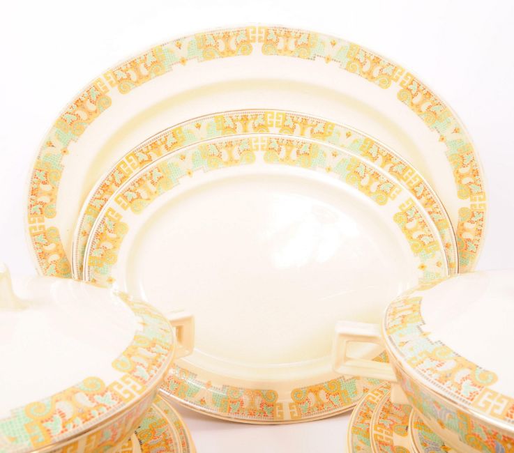 Johnson Bros - a collection of 20th century dinnerware, to include 'Victorian' dinner plates, x2 casserole dishes, x3 serving plates and a gravy boat by Johnson Bros England and x2 'Caledonia' by Alfred Meakin casserole dishes. Marked to the bases.