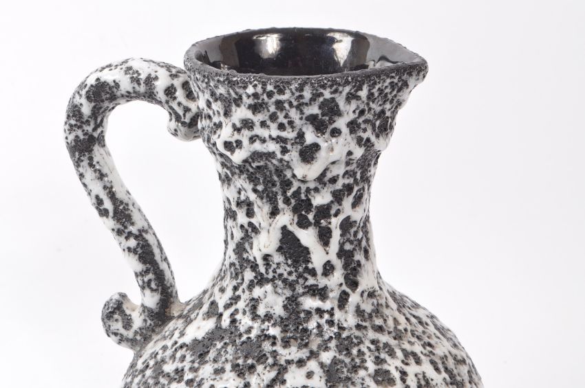 Jopeko - A vintage mid 20th century Jopeko West German fat lava style glaze ceramic jug / vase. The jug having black ground with white drip glaze overtop. Having scrolled handle. Marked 70 28 to base.