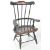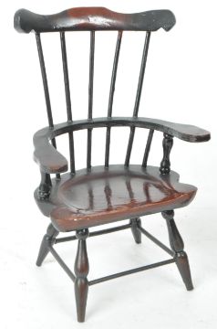 A pair of 20th century paper mache combe back windsor chairs. The chairs having shaped top rail with spindles to back over saddle seat. Measures 22cm tall.