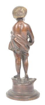A 20th century bronze sculpture of a young boy, depicted with half a robe, standing on a rock and raised on a plinth base. All one bronze cast. Signed 'Pous Au' to the base. Measuring approx. 39cm tall.