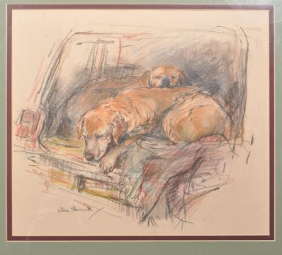 A vintage 20th century oil pastel drawing of two Labrador dogs in the boot of a car. Signed by artist to the bottom left corner, however signature is illegible. Framed, mounted and glazed, measuring approx. 44cm x 48cm.