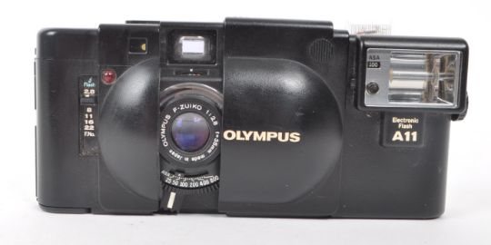 Olympus - XA - A circa 1980s Olympus XA 35mm rangefinder camera. The camera in black colourway, having 35mm F2.8 lens. Alongside Olympus A11 electronic flash unit.