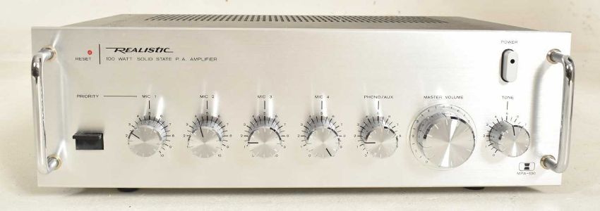 Realistic - Solid State - Model MPA-100 - a public address amplifier having a brushed metal front. Within the original box with the manual.