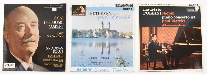His Masters Voice Label - a selection of 20+ classical long play / LP vinyl record albums. The lot comprises Elgar The Music Makers (ALP 2311), Beethoven Violin Concert (XLP 20043), Chopin Piano Concert No.1 (ALP 1794), Richter Plays Schubert (ASD 561), Mozart Violin Concertos No.1 No.2 (ALP 2042), Beethoven: The Two Piano Trios, Op.70 (ASD 2258), Virtuosi di Roma Renato Fasano (ALP 1594), John Ogdon PLays Liszt (ALP 2283) and more. VG to VG+ condition across the lot.
