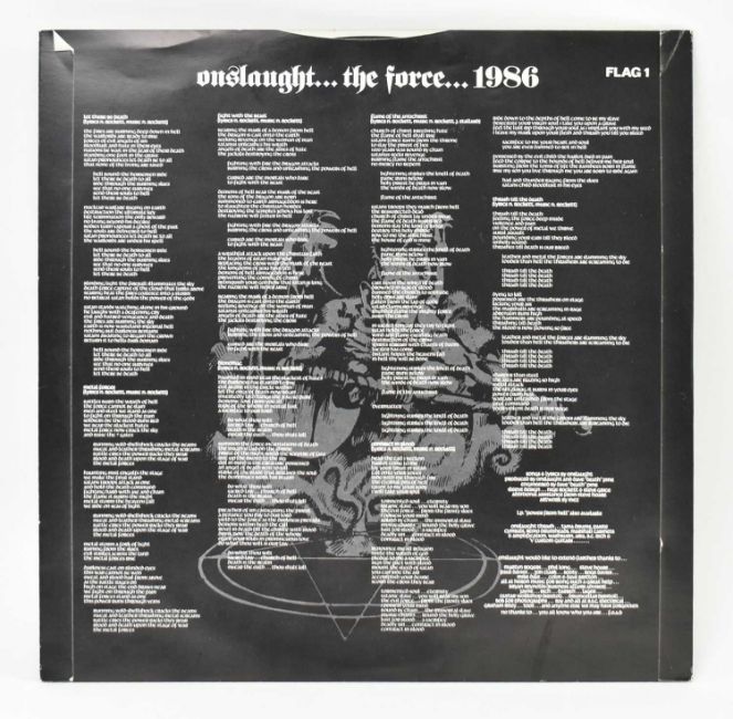 Onslaught - The Force - a long play / LP vinyl record album on the Under One Flag Label (FLAG 1). With inner picture sleeve. Matrix numbers FLAG 1 A1 / FLAG 1 B1. VG+ condition.