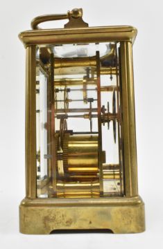 Charles Frodsham & Co., Paris - a late 19th / early 20th century brass carriage clock in leather case. The clock having a shaped top handle over glazed front and sides. White enamel face with Roman & Arabic numerals to chapter ring. Stamped to face and back. Number 20078. In original leather case with glazed front. Key present.