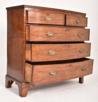 A George III early 19th century mahogany bow fronted chest of drawers. The chest having a straight top with reeded edges. Bank of two over three drawers with brass escutcheons and handles. Raised on bracket feet.