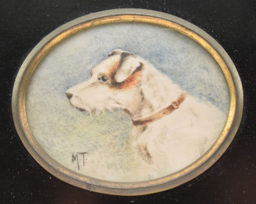 X (ARR) An Edwardian circa 1902 miniature portrait on ivory of a terrier dog. Dog pictured from chest up in side profile. The miniature titled Champion Cauldwell Scotch on label to verso. Signed M. T. to front. Framed in ebonised frame with brass acorn finial.Ivory CITES exemption reference: Q1YQYF87 Portrait measures approx. 6cm x 4.5cm, 12.5cm x 10cm to include frame.