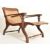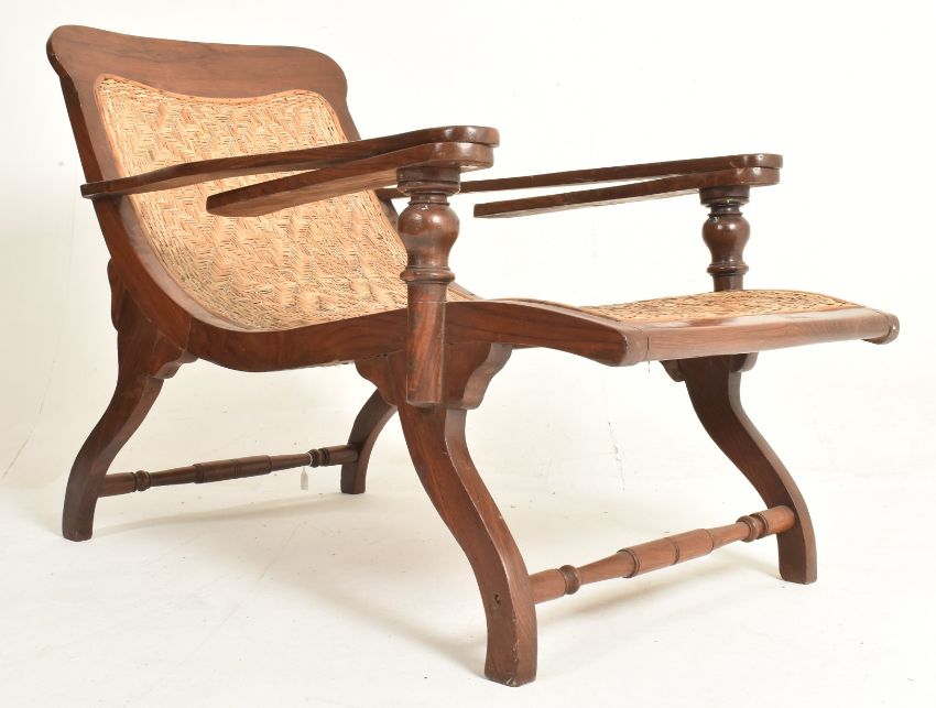 An early 20th century plantation teak & wicker rattan seat lounge chair. The chair having a reclined backrest with extending armrests over a wicker-woven back rest & seat. All raised on shaped supports united by stretchers.