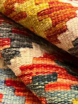 A 20th century Anatolian Turkish Kilim floor carpet runner rug. The runner rug having a central panel with polychrome diamond-shaped decorations all enclosed within an optical illusion outer border. Short tassels to ends.