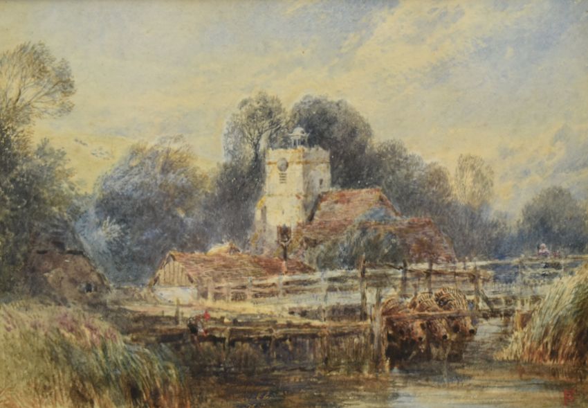 (ARR) Attributed to Myles Birket Foster RWS (British, 1825-1899) - The Village Church - a 19th century watercolour on paper landscape painting. Unsigned. Mounted, framed & glazed. With Christie, Manson & Woods, 1956 auction label to back, with further annotations from the auction.Myles Birkett Foster was a British illustrator, watercolourist and engraver in the Victorian period. Numerous key galleries and museums such as Chris Beetles Gallery have featured Myles Birket Foster's work in the past. Myles Birket Foster's work has been offered at auction multiple times, with realized prices ranging up to 341,758 USD, depending on the size and medium of the artwork. Since 1998 the record price for this artist at auction is 341,758 USD for The Meet, sold at Christie's London in 2001. In the past 12 months, their works on paper have averaged 986 USD, while his paintings have sold for an average of 484 USD. Measures approx. 9cm x 13cm excluding frame.