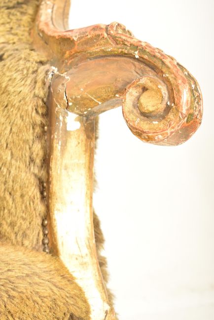 A French 19th century giltwood & faux fur upholstered Provincial fauteiul bergere armchair. The armchair having an intricately carved backrest with scrolled & foliate motifs. C scrolled elbow rests, all raised on carved supports with acanthus leaves details. Upholstered in fur-like fabric.