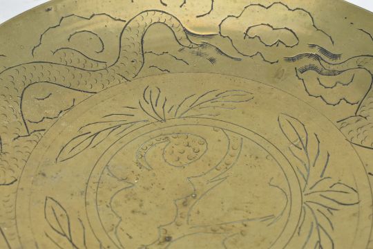 Two 20th century Chinese and Indoneisan brass copper pieces. The lto to include an early 20th century brass conical dish engraved with drragons, marked CHINA to the base. Together with a 20th century footed bowl decorated with foliage and flowers.