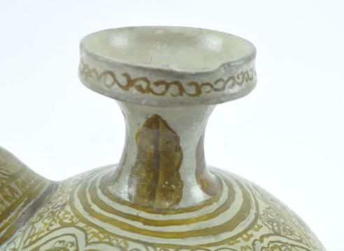 A South Eastern Thai Sawankhalok kendi. The ceramic globular body with mammiform spout beneath a flared neck with flared tapering mouth. Painted in yellowish brown with foliate detail throughout.