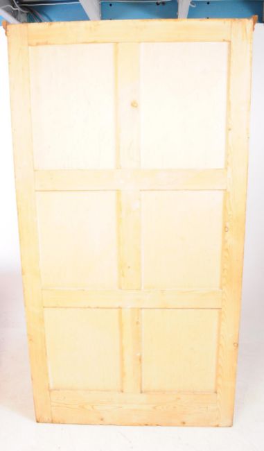 A Victorian 19th century pine vestry church two door wardrobe. Pediment top with twin full size fielded panel doors with a shelved interior to left and hanging space to the right. Raised on a plinth base. Measuring approx. 207cm x 114cm x 47cm.