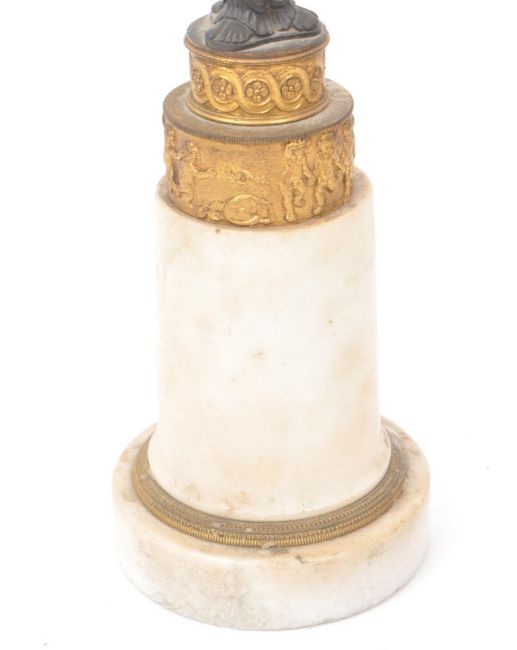 A pair of 19th century gilt and bronze French candelabras. With two gilt foliate arms, with a bronze column of three female figures. All raised on marble circular base with gilt cherub banner. AF.