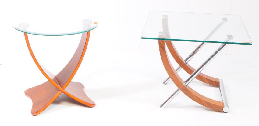 British Modern Design - A Contemporary occasional table with x-frame wooden base together with another similar table having chrome supports