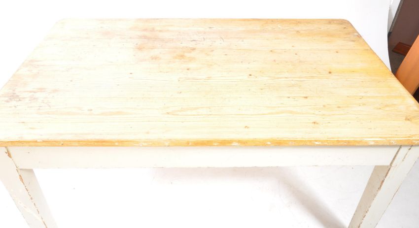 A 19th century pine refectory table kitchen farmhouse dining table. Large plank top with painted upright tapering legs and cutlery drawer with turned wooden pull knob handles.