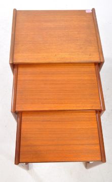 G-Plan Furniture - Mid century quadrille pattern teak wood nest of tables. The tables being raised on shaped legs with returns to each graduating table.