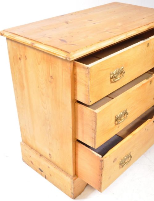 A pine Victorian 19th century chest of drawers. Plank chamfered edge rectangular top with a bank of three drawers. All raised on bracket feet with ornate swing brass pull handles.